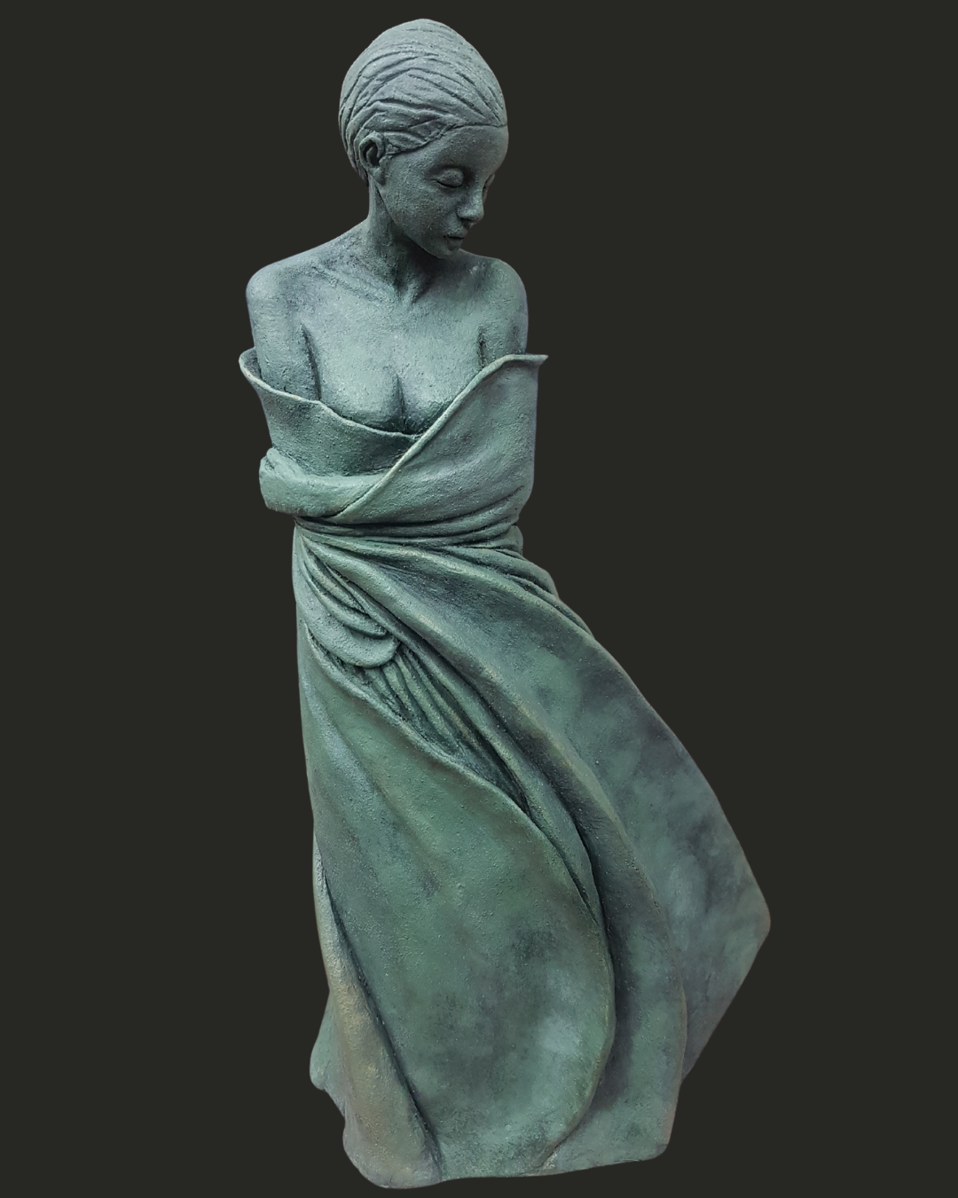 Elégance, drapé, finesse, douceur. La femme a cette faculté et cette simplicité de se rendre désirable par sa gestuelle, sa grâce, sa séduction. Suggérer subtilement une partie de son corps, laisser apparaitre sa féminité sans se dévoiler. Est-ce, ce qui a permis le coup de cœur de mon premier client. Une fierté pour l'artiste que je suis. Matière : argile cuite et patine Dimensions : 50 x 20 x 25 cm